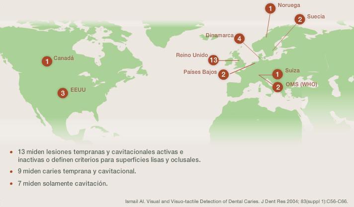 Figura 2: Sistemas de clasificación de caries anterior a ICDAS Estos sistemas incluyen un número de artículos clave que unen la valoración clínica visual de la extensión de la lesión y actividad a la validación histológica (7,8) con el fin de producir un sistema de clasificación de caries integrado (9). El Sistema Internacional de Clasificación y Manejo de Caries. que se construyó posteriormente con base en ICDAS, han sido el tema de una gran cantidad de artículos revisados por pares alrededor del mundo (2). Los autores esperan que la guía sea útil para atraer la atención de un mayor número de clínicos y educadores de todo el mundo hacia el Sistema Internacional de Clasificación y Gestión de Caries. También esperamos que esta guía proporcione una indicación acerca de la forma como se puede operacionalizar el sistema en cada país.
