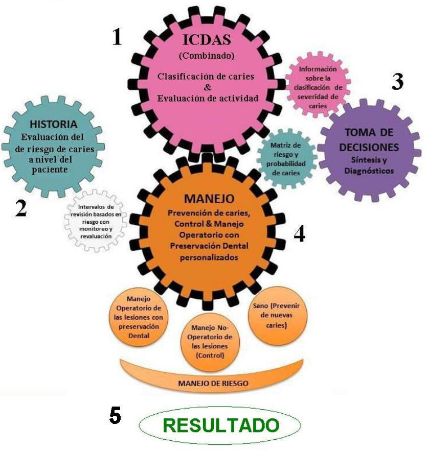 Figura 1: Ciclo ICCMS Por mucho tiempo, los campos de detección, evaluación del riesgo, diagnóstico y manejo de caries han sido dominados por dogmas y falta de transferencia de la mejor evidencia a la práctica clínica (1). Por lo tanto, en la última década un grupo internacional de cariólogos, epidemiólogos y clínicos ha trabajado en el desarrollo de protocolos que promuevan el manejo adecuado de la caries, basado en la mejor evidencia biológica y clínica. El Sistema Internacional de Clasificación y Gestión de Caries está ligado a ICDAS. Mientras que ICDAS proporciona métodos flexibles y de gran adopción a nivel internacional para la clasificación de los estadios del proceso de caries y el estado de actividad de las lesiones; ICCMS proporciona a los odontólogos y su equipo de salud oral opciones para integrar y sintetizar información del diente y del paciente, incluyendo el estado de riesgo de caries, con el fin de planear, gestionar y hacer seguimiento de la caries en la práctica clínica. La Guía ICCMS fue desarrollada por la Fundación ICDAS II, con la ayuda de otros expertos. Incluye un conjunto integral de protocolos clínicos (construidos con base en la mejor evidencia disponible) para apoyar la elaboración de la historia clínica, el examen clínico, la evaluación del riesgo y la planeación del cuidado personalizado con el fin de permitir mejores resultados en el tratamiento de la caries dental a largo plazo. Ver tabla 1 (3).