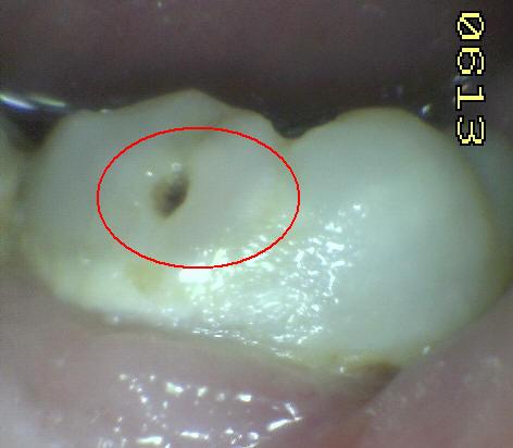 • En la imagen derecha un código 3 de ICDAS, hay un defecto de esmalte en vestibular menor a 0,5 mm