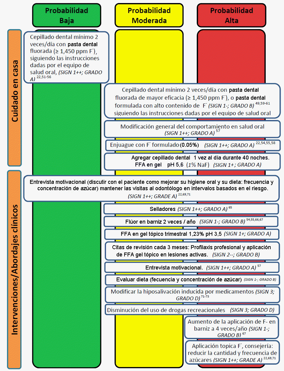 La intensidad de la intervención es acumulativa, así que para pacientes con probabilidad de riesgo de caries moderada, se deben considerar todas las intervenciones indicadas para pacientes con baja probabilidad de riesgo. De forma similar, en pacientes con probabilidad de riesgo alta, se deben considerar todas las intervenciones preventivas recomendadas para pacientes con probabilidad de riesgo baja y moderada en el plan de cuidado del paciente. Ver tabla 16 Los pacientes discapacitados deben ser tratados como pacientes de alto riesgo.