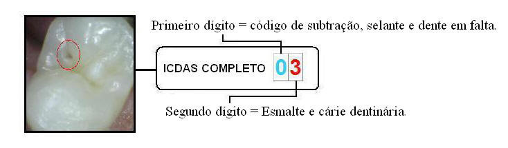 | A nomenclatura é composta por dois dígitos, o primeiro dígito corresponde ao "Código de restauração, selante e dente em falta"; e o segundo dígito corresponde ao "Código de cárie em poços e fissuras". Veja a imagem no fundo como um exemplo de codificação. | ||||||