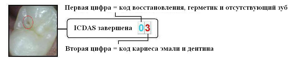 | Первая цифра в этом случае 0 идентифицирует поверхность зуба как «не восстановленная или запечатанная»; вторая цифра в этом случае 3 обозначает поверхность зуба как эмаль и кариес дентина: «Потеря целостности эмали <0,5 мм., дентин не виден». Кодирование выполняется на единицу площади, границы поверхности зуба должны быть известны; так что регистрация распространения кариеса стандартизирована. |