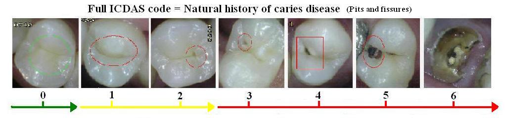 There are minor variations between the visual signs associated with each code depending on a number of factors, including the characteristics of the surface (pits and fissures versus free surfaces), if there are adjacent teeth present (mesial and distal surfaces) and whether or not There is caries associated with a restoration or sealant. Therefore, a detailed description of each of the codes are given under the following titles to assist in the training of examiners in the use of ICDAS.