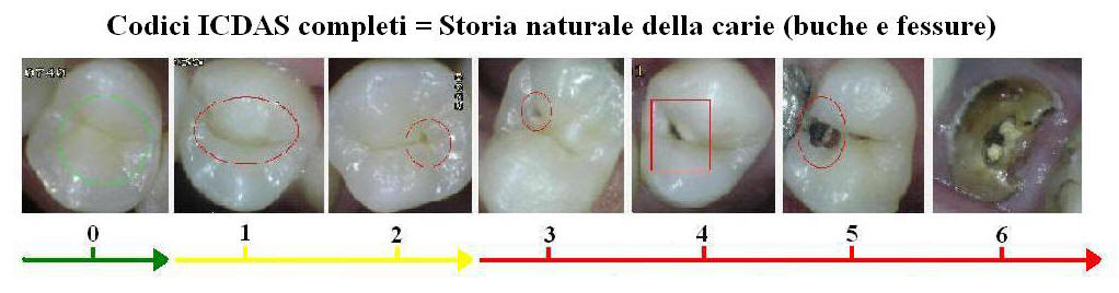 ICDAS Complete presenta 7 categorie, la prima per i denti sani (codice 0, in verde) e le due successive per la carie limitata allo smalto, macchia bianca / marrone (codici 1 e 2, contrassegnati in giallo). Le seguenti due categorie (codice 3 e 4, in rosso) sono considerate carie che si estendono allo smalto senza dentina esposta. E le altre due categorie rimanenti (codici 5 e 6), considerate carie con dentina esposta. Vedi l'immagine in basso.
