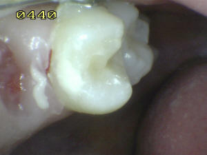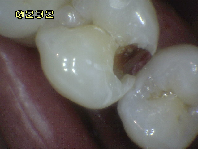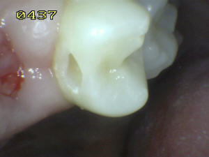 Vista desde vestibular donde se observa la caries mesial y