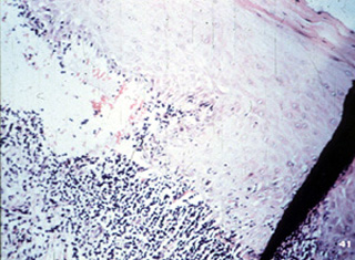 plano erosivo, sin embargo, la degeneración de la basal procede a un punto dónde el epitelio se separa del tejido conjuntivo subyacente. Note en esta vista a