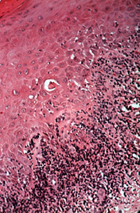 El liquen plano erosivo ofrece una separación entre el epitelio y el tejido conjuntivo inflamado.