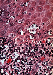 Con un aumento más potente se observa que la inflamación es casi completamente de naturaleza linfocítica.