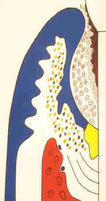 Cuando el desagüe se bloquea más o menos totalmente la reacción en el tejido es acelerada. En el  flujo hay un aumento de  leucocitos que lleva a la concentración de pus. El pus consiste en una mezcla de microorganismos y leucocitos muertos que su vez sueltan el contenido de los lisosomas. Agregando a esto  las substancias y enzimas de las bacterias. Se atacan las células del epitelio  y fibroblastos y en el tejido conjuntivo el colágeno es  destruido. Cuando el epitelio de unión es destruido, se reclutan osteoclastos y comienza la reabsorción ósea durante la formación del absceso. La destrucción del tejido es funcional en el sentido en que el desagüe o se crea a través de la formación de una fístula o que la presión del pus abre el desagüe a través de la bolsa periodontal. El circulo vicioso así se rompe. El tratamiento también abre el desagüe y se resuelven  los procesos inflamatorios. Probablemente la formación del absceso también puede ocurrir en una  microescala. Es común observar en las secciones histológicas del tejido  gingival enfermo que los leucocitos aumentan en gran  número en el epitelio de unión, en la superficie del diente y en el tejido conjuntivo lateral al epitelio de unión. Podría ser que semejante mecanismo frecuentemente es responsable para la progresión de pérdida de la atadura periodontal. Es experimentalmente y clínicamente casi imposible  determinar la causa y relaciones de efecto, como el daño puede determinarse después de que ha ocurrido y que en una  microescala nos faltan los métodos para medir.