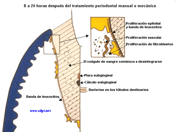 2. Entre 8-24 horas después  hay cambios notables en el tejido conjuntivo, en el epitelio remanente  y el coágulo de sangre entre la superficie del diente y el tejido conectivo. Se liberan  mediadores para la inflamación,  comienza la proliferación celular y la desintegración del coágulo. Los estudios actuales indican que los remanentes de cálculo  subgingival invariablemente están  presente así como  porciones de placa  subgingival. Además es probable que bacterias estén presentes en los túbulos dentinarios. Las bacterias subgingivales remanentes son probable causa de nuevos tratamientos periodontales (periodontitis refractaria).