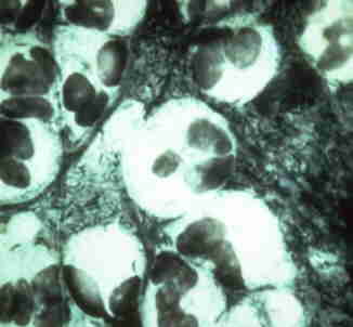 Ésta es una muestra de un bolsillo periodontal profundo en un humano. Se ven los numerosos leucocitos neuttrófilos inhibiendo el desarrollo bacteriano Los estudios han mostrado que las células a pesar de la condición muy exigente tienen una buena capacidad funcional.