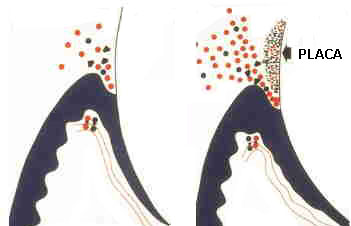 Los leucocitos migran continuamente de los vasos hacia el epitelio del surco y el epitelio de unión. Durante la condición saludable esta migración es de intensidad menor mientras en estado de enfermedad crónica (enfermedad periodontal) la migración es intensa. Más del 90% de los leucocitos son células neutrófilas polymorfonucleares. Monocitos, macrofagos y linfocitos son alrededor de 1 a 3%. La causa de dicha migración continua es la presencia de factores químicos bacterianos. Los vasos bajo el epitelio del bolsillo consisten principalmente en venulas de capilares. Esta parte de la microcirculación reacciona hacia cualquier trauma con permeabilidad aumentada y los leucocitos se pegan durate su migración. Los mecanismos para el desarrrollo de estos eventos son complicados e involucran varios pasos y mediadores.