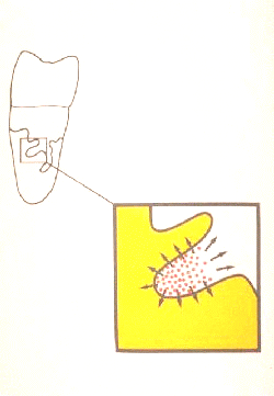 Ilustración esquemática de los mecanismos de destrucción periodontal. Las bacterias subgingivales se extendieron en todas las direcciones por su proliferación, que es determinado por la eficacia de los mecanismos de defensa. El resultado son  lesiones periodontales pequeñas que no son notables clínicamente hasta que una área mayor haya estado envuelta y puede diagnosticarse con el sondaje clínico o por el análisis de imágenes radiográficas.