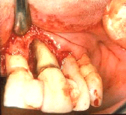 La anatomía macroscópica de la destrucción periodontal en la superficie mesio-bucal del central superior derecho. El colgajo  levantado hasta la línea mucogingival descubre un gran defecto óseo. En la superficie  mesial el defecto incluye una destrucción infraósea con la permanencia de una pared ósea. En la superficie bucal del diente el defecto intraóseo  es  poco profundo  alrededor de 1 mm de profudidad. La superficie de la raíz  bucal y los sitios de  mesial son desiguales con  numerosos hoyos y surcos. Estos defectos anatómicos probablemente han contribuido al modelo de colonización  bacteriana  subgingival y han determinado el modelo de destrucción ósea.