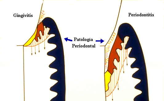 Se considera que la  Gingivitis es la precursora  de la  Periodontitis pero no es conocido  que la  gingivitis se convierta en  periodontitis o si las dos enfermedades sólo ocurren simultáneamente. La lesión del tejido blando en la gingivitis y  la periodontitis se caracteriza por tres tipos de reacción principales: