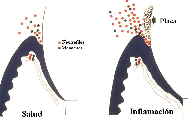 Clínicamente en  la gingiva saludable  hay una migración continua de leucocitos de los vasos capilares al epitelio de unión  y a la región del surco ó hendidura gingival. Esta migración leucocitaria  se refuerza en la inflamación gingival y periodontal;  y las células aumentan  en el epitelio de surco y de la bolsa.  Las células participan en la defensa del tejido contra la invasión franca de bacterias.