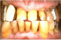 Varón de  63 años de edad con  enfermedad periodontal severa. Los dientes se han desgatado severamente y al sondaje de las bolsas periodontales encontramos una profundidad de  6-8 mm. En el canino inferiór puede observarse un épulis. Las señales de inflamación severa están presentes. La condición necesita tratamiento quirúrgico  con  gingivectomía, raspaje y alisado radicular. El paciente es instruído en los procedimientos de higiene oral.