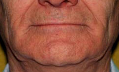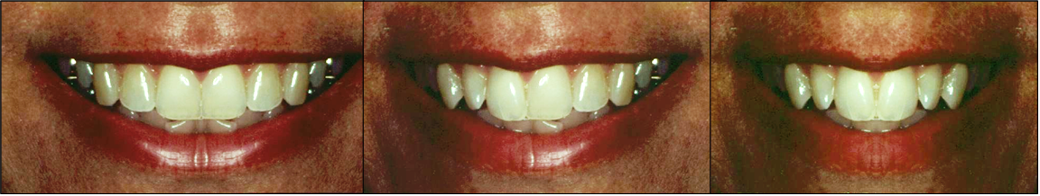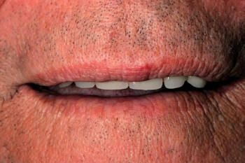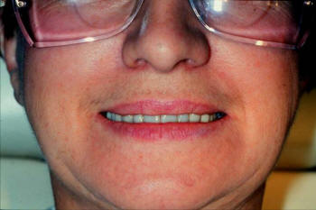 La unión de la mucosa oral  solamente debe ser visible cuando los labios son ligeramente separados. Si no es visible hay insuficiente soporte. Fotografía derecha.