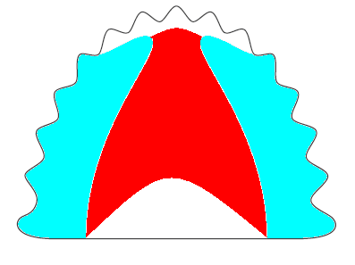 • En celeste zonas de contacto de la lengua cuando se produce el sonido "S". Un paladar abultado produce ceceo, en color rojo.
