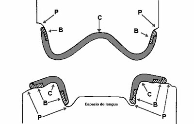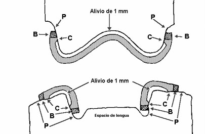 • Vista y corte transversal en los modelos superior e inferior, que indican las áreas de alivio para el material de rectificación de bordes (B), y el contacto  con la cubeta individual con las estructuras anatómicas edéntulas (C). Observe que el material para rectificación de los bordes se corto, un poco corto de la extensión periférica intencional de la impresión (P). Se utiliza una impresión preliminar para capturar las estructuras anatómicas en las áreas de alivio y periféricas.