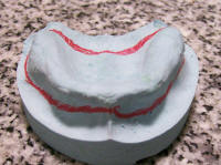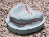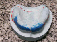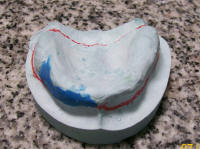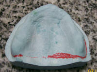 Se debe desgastar 0,5 milímetros de profundidad. Para compensar la contracción del acrílico durante la etapa de curado. Límite pospalatal y grado de profundidad del desgate del modelo de la prótesis superior Se utiliza plastilina para eliminar las retenciones Se observan las sombras en el modelo, que indican las zonas retentivas