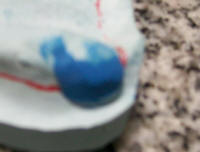 Marcando zona retrocigomatica derecha, en la tuberosidad existe una zona retentiva Se observa un frenillo vestibular de inserción muy alta Aquí se observa la zona retentiva de la tuberosidad derecha (Flecha azul) Desgaste del modelo en la zona de la línea de la "A" con forma de mariposa