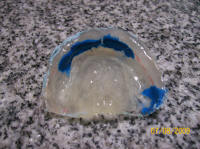 Recorte de la lámina de acrílico más allá del diseño de la cubeta Cubeta ya recortada. Se utiliza acrílico de auto curado transparente para darle fortaleza. Se agrega a una parte del monómero y 2 partes de polímero, y se mezcla en forma suave para no incorporar burbujas a la mezcla.