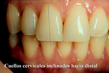 Los cuellos dentarios se inclinan hacia distal desde el incisivo