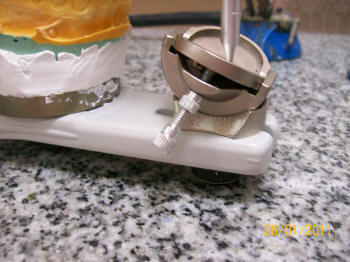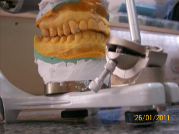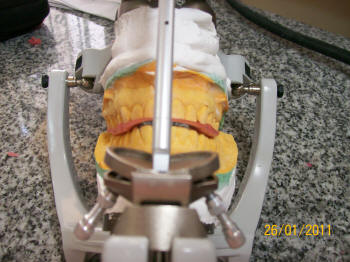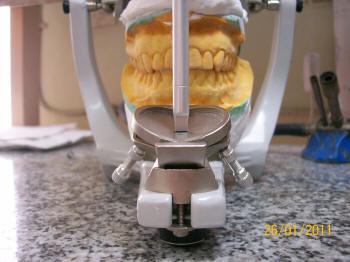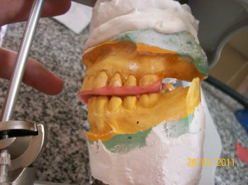 Se comienza a realizar la guía anterior, debe tener superficies de contacto durante los movimientos de excéntrica, como indica el papel de articular. Debe haber contactos caninos en  protrusiva y en excéntrica (los centrales y laterales pueden participar en el movimiento protrusivo) Es más fácil de chequear el movimiento de los caninos en protrusión y en excéntrica. Ver instalación