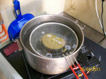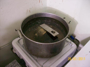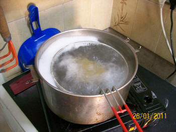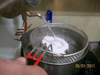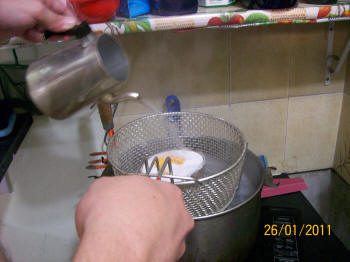 Se prensa nuevamente y se lo coloca en una brida bien ajustada para iniciar el proceso de baño maría. A una temperatura inicial de 20ºC hasta legar a los 65ºC durante una hora y luego otra hora a temperatura de ebullición (99º C)