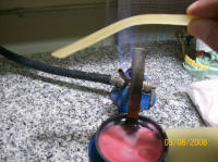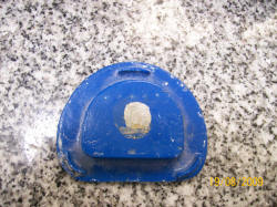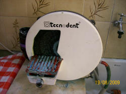 Se ubica la base de la mufla sobre el acrílico y con un marcador indeleble negro contorneamos su forma. La silueta de la mufla impresa en el acrílico Para ajustar y recortar los bordes usamos la recortadora de yeso de nuestro laboratorio, con abundante agua, para no empastar el disco de carburo.