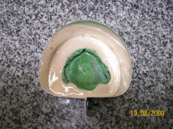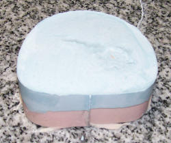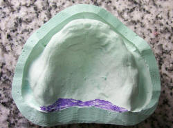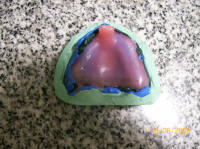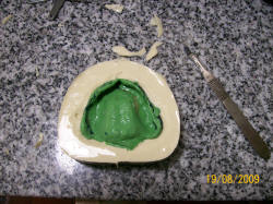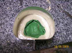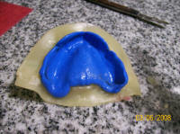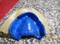 Yeso piedra vaciado en el encofrado para obtener nuestro modelo de trabajo con sus bordes funcionales protegidos. El zócalo debe desprenderse de encofrado en alginato Modelo listo para ser recortado y sumergido en baño maría, para desprender la cubeta individual.