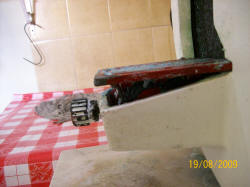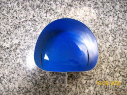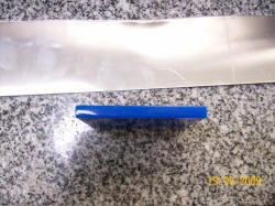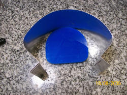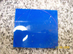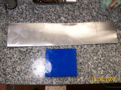 La platina de la recortadora se ajusta en ángulo recto al disco. Base de acrílico recortada Se toma la lámina de aluminio que tiene 35 cm. de largo por  0,5 mm.  de espesor  y se ajusta al contorno con un ayudante.  Para esta maniobra debe usar guantes de tipo industrial, dado que el aluminio puede producir cortes en los dedos y "no olvide que sus manos son las herramientas de su trabajo"