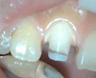 El provisorio llegua al borde de la restauración. Eliminar mango identificatorio de la corona y desgastar incisal hasta la misma altura l del homologo.  Y chequear oclusión