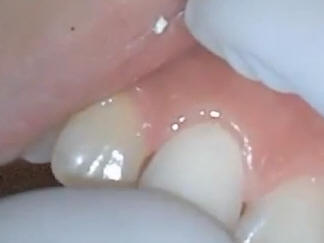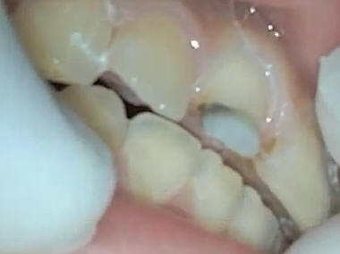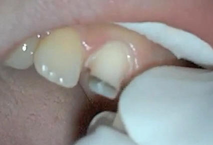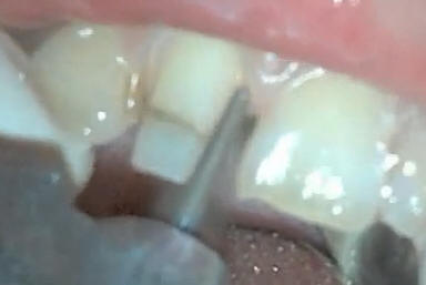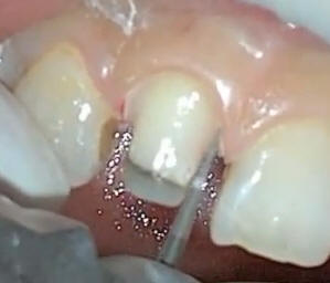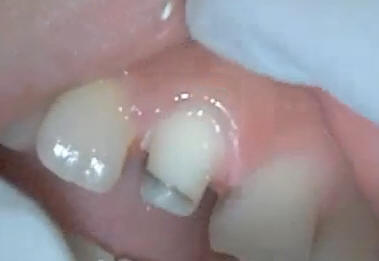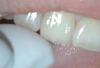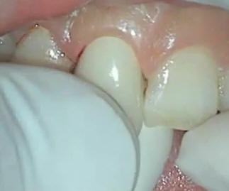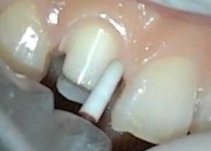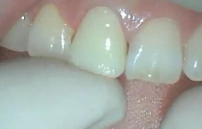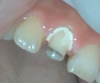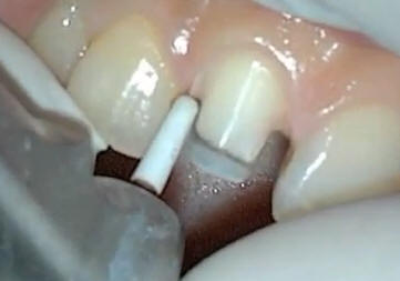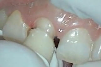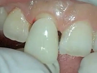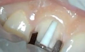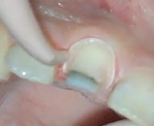 Aislar y secar la zona para el cementado, dejar endurecer para luego quitar los excesos de material sin dañar los tejidos blandos. Corona de alúmina instalada.