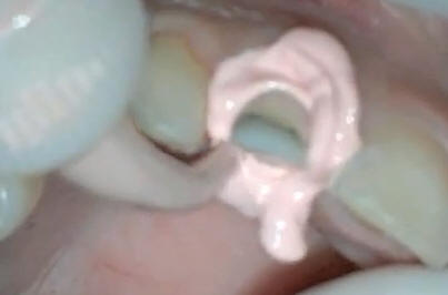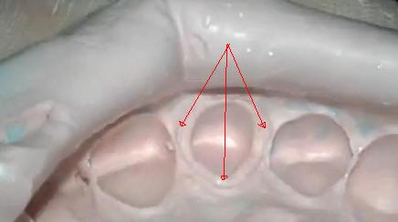 Con una cubeta estandard y silicona pesada impresionar el arco superior. Correcto registro para generar el modelo de trabajo. Observe el hombro en la impresión con silicona