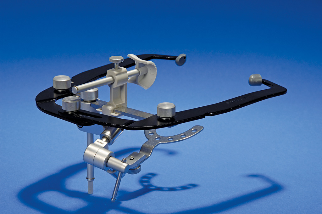 5. Debe aceptar la transferencia de un arco facial utilizando un punto de referencia anterior. Esto hará posible introducir cambios menores en la dimensión vertical del paciente sin apenas modificar la posición de céntrica. Además, la transferencia del punto de referencia anterior facilita la disposición del grupo incisivo con la inclinación vestíbulo-lingual deseada.