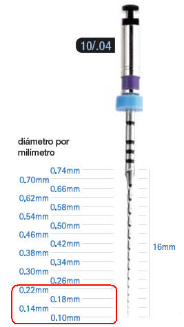 Es conveniente tener limas cuyo largo sea de 25 mm y  21mm. para los dientes anteriores y los posteriores. Se presenta con longitudes de trabajo de 16 mm. y de 21 mm. (3) Y con distinto porcentaje de conicidad.