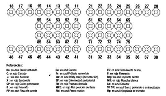 El croquis dental esta formado por 5 caras de forma redondeada que representa solo la parte visible del diente, como la corona. A título de identificar la patología dental se indica que dichas afecciones se graben en color rojo, y en azul lo que no es patológico; ver referencias en la historia clínica dental.