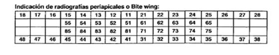 Indicación de radiografías periapicales o bite wing: En este grafico debe marcar con una P ( radiografía periapical) o con una W (radiografía bite wing) el casillero correspondiente al diente irradiado.