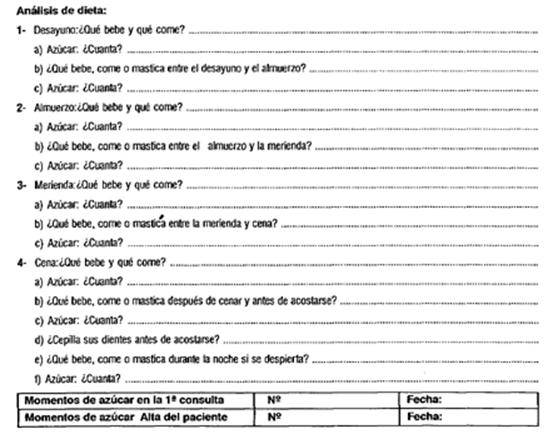 Como se muestra en la historia clínica dental el análisis de dieta esta desarrollado con preguntas concisas que tratan de identificar los momentos de azúcar del paciente durante el día. Como parámetro eficaz en el control de dieta del paciente, el profesional deberá llegar a una acuerdo sobre la eliminación de las comidas en el punto b) c) e) f). y aumentar el volumen de ingesta en 1- 2- 3- y 4-