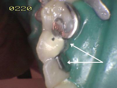 Observe los excesos de cemento de resina de curado dual (flechas
